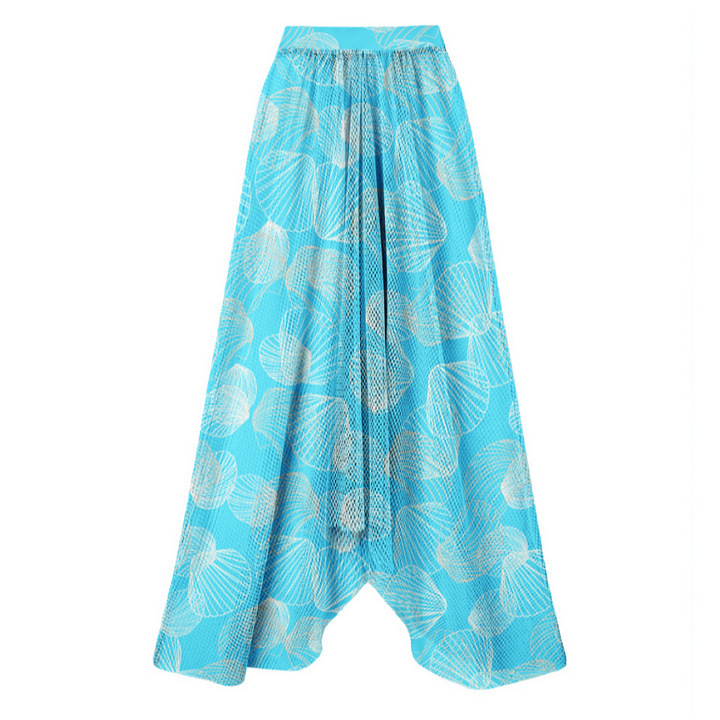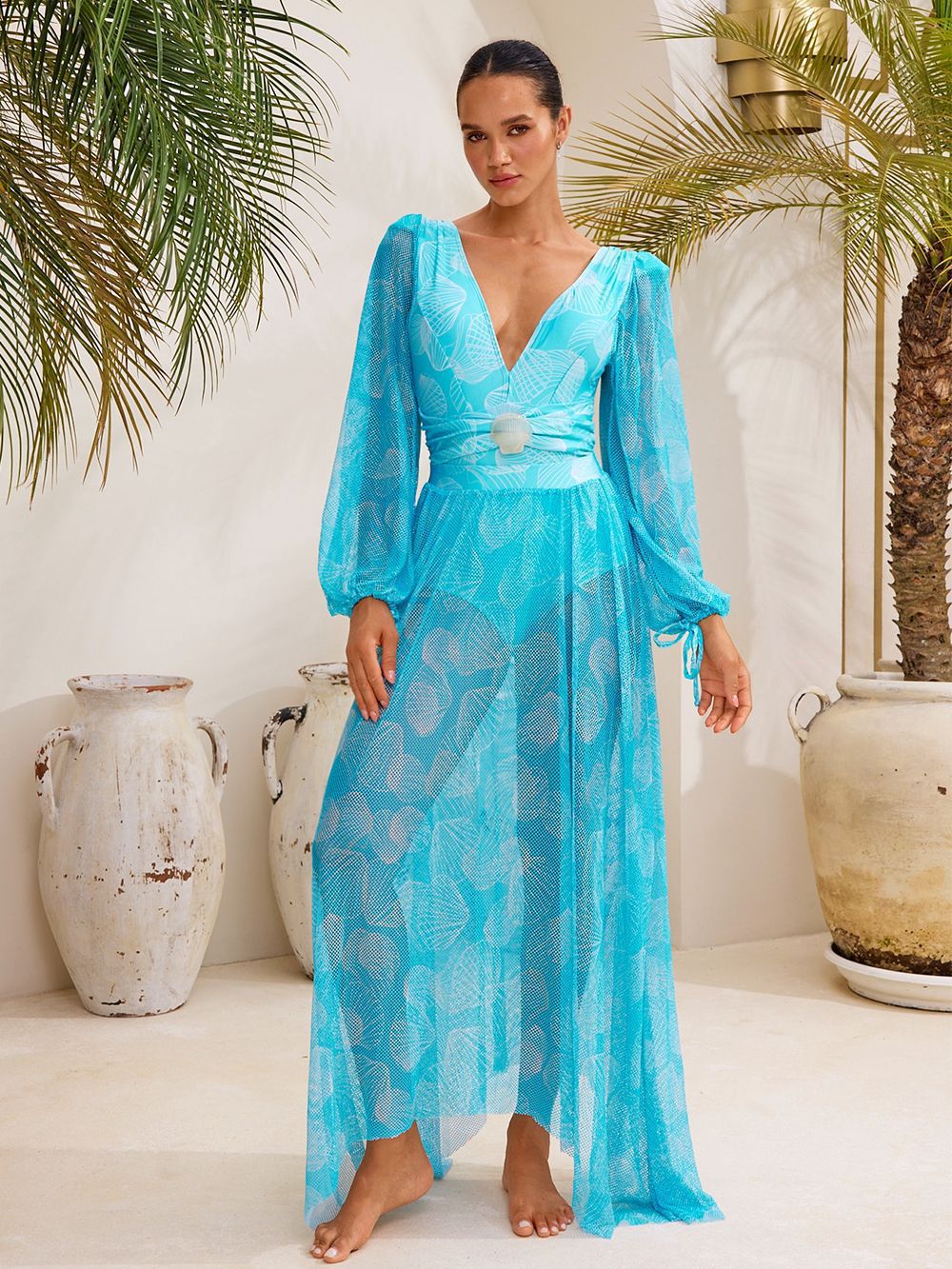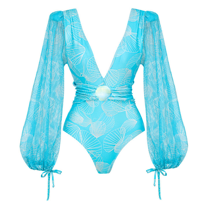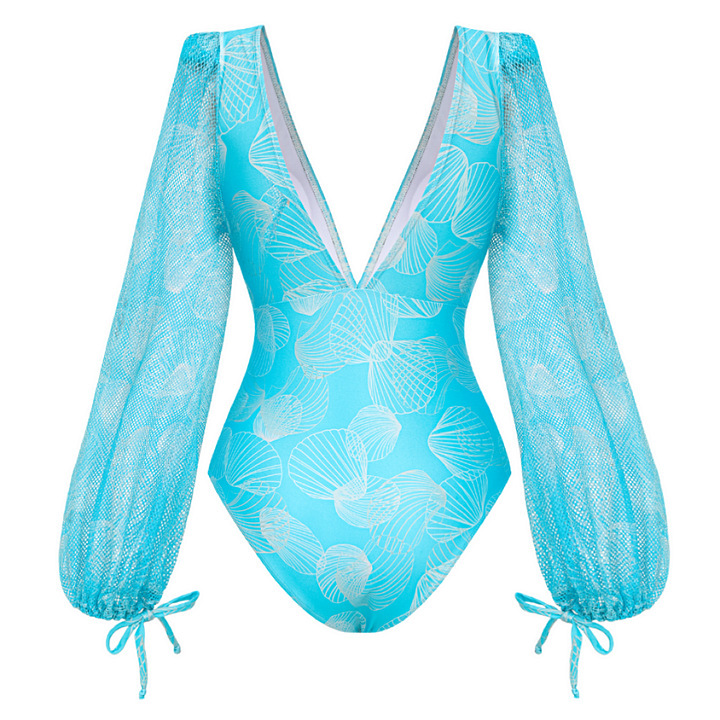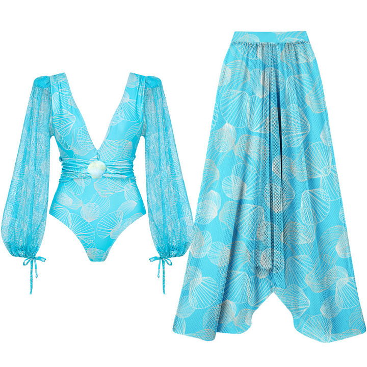 Women Swimsuit V neck Mesh Long Sleeve Glossy Shell Printed One Piece Swimsuit Two Piece Set